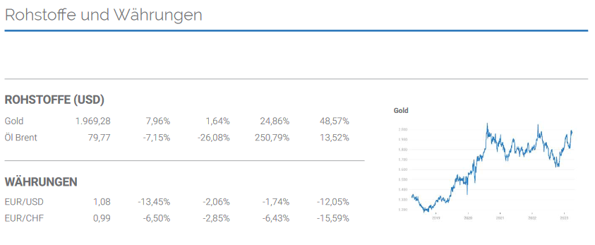 Die leicht positiv veränderte globale BIP-Prognose war verbunden mit vermindertem Preisdruck. So sank der CRB-Rohstoffpreisindex im ersten Quartal 2023 von 298 auf 279 Punkte und markierte das tiefste Niveau seit Februar 2022. Die Themen Versorgungssicherheit mit Energie und Rohstoffen als auch deren Preise belasteten tendenziell weniger. Das Situationsmanagement insbesondere in Europa war und ist zunächst erfolgreich. Damit sanken die von außen auf die Wirtschaftsräume wirkenden Inflationseinflüsse. Dagegen steigt über die aktuellen Lohnforderungen potentiell der innere Inflationsdruck. Die Öffnung Chinas mit dem Ausstieg aus der Corona-Politik lieferte einen positiven Impuls für die Wirtschaftsaussichten Chinas und der Weltwirtschaft auch im Hinblick auf potentiell verringerte Lieferkettenprobleme und damit diesbezüglich verringerten Inflationsdrucks. Der IWF setzte die BIP-Prognose Chinas um 0,8 % per 2023 auf 5,2 % in die Höhe. Goldman Sachs erhöhte im März 2023 die BIP-Prognose per 2023 auf 6,0 %.